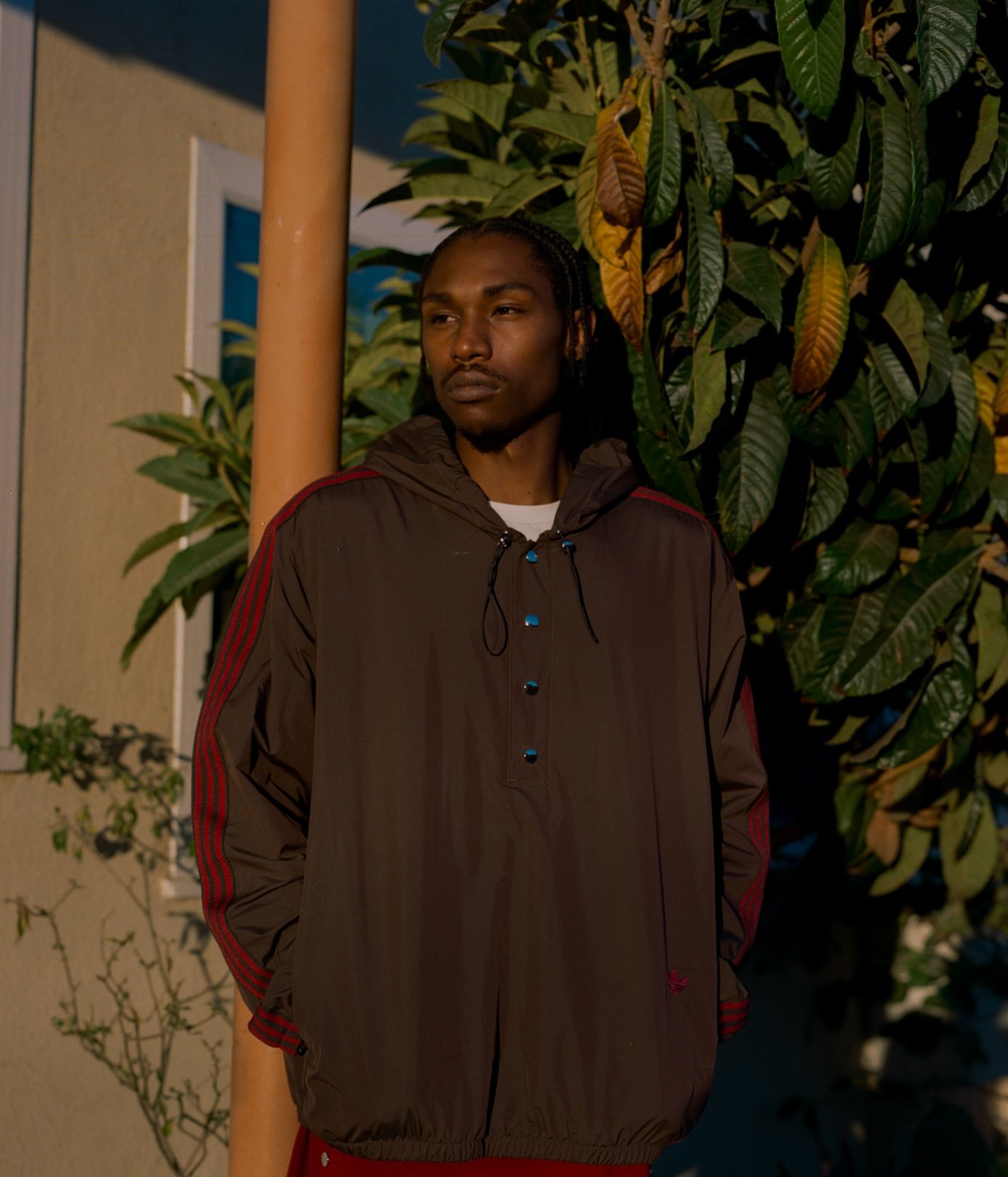 Evan wears jacket and pants ADIDAS ORIGINALS BY WALES BONNER.