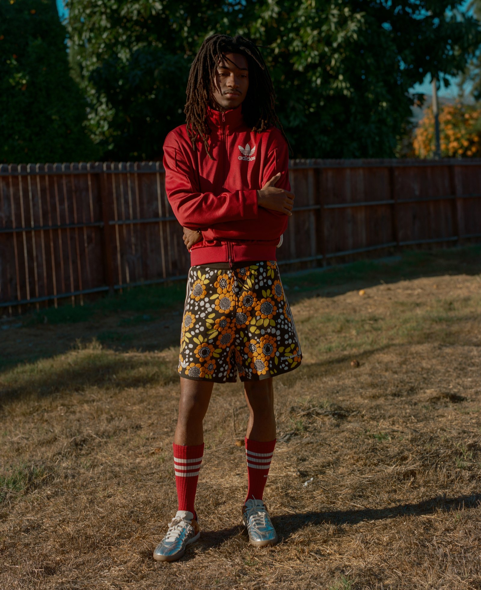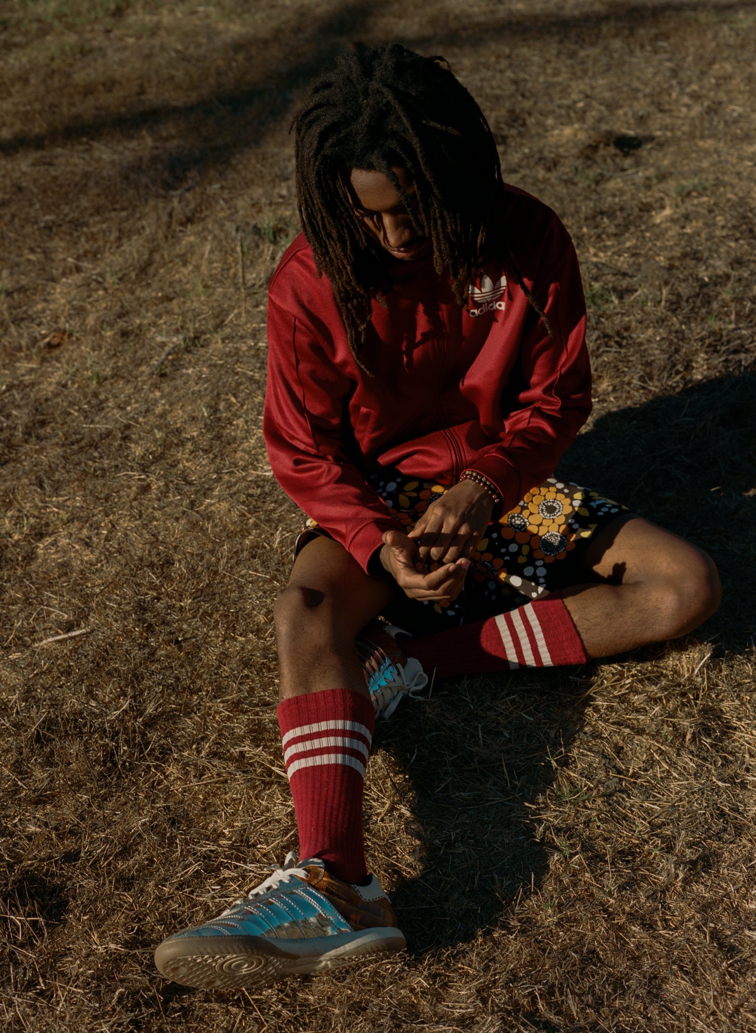 Kylan wears jacket, shorts, socks and shoes ADIDAS ORIGINALS BY WALES BONNER.
