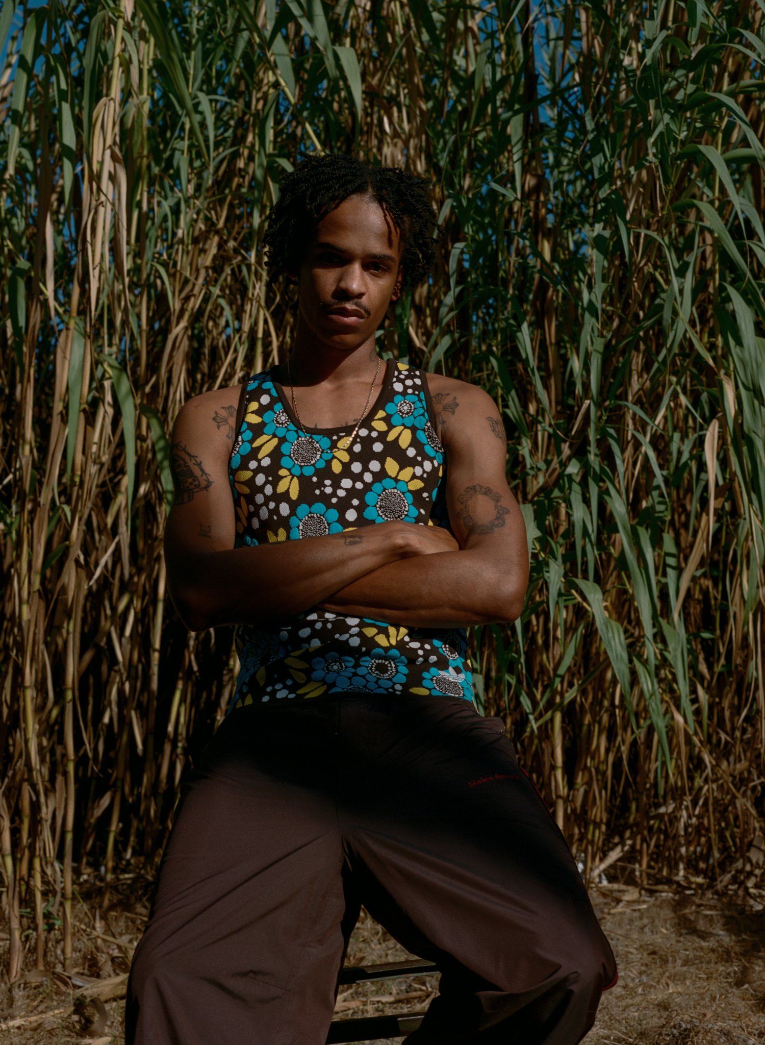 Kylan wears tank top, pants and shoes ADIDAS ORIGINALS BY WALES BONNER.