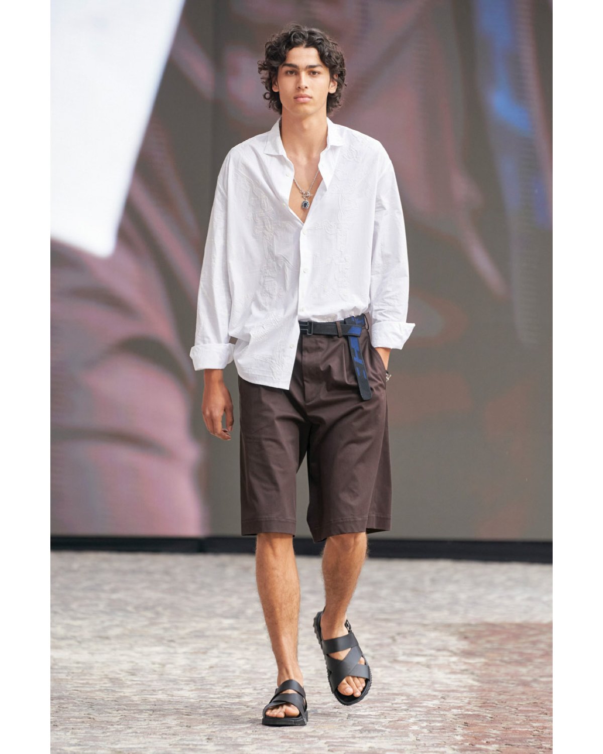 Outfits were styled with casual sneakers, classic Chelsea boots in perforated black or walnut leather, and fawn suede. In addition, Nichian debuted a strappy flat sandal, fastening the foot in mossy green and black with a bohemian ambiance.
