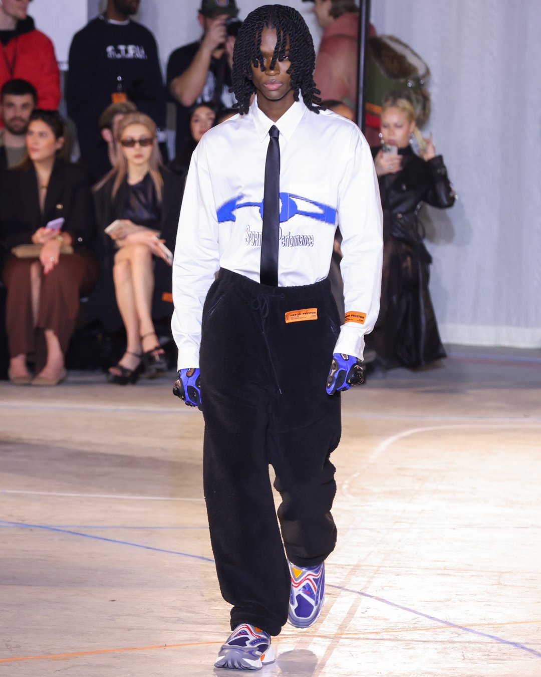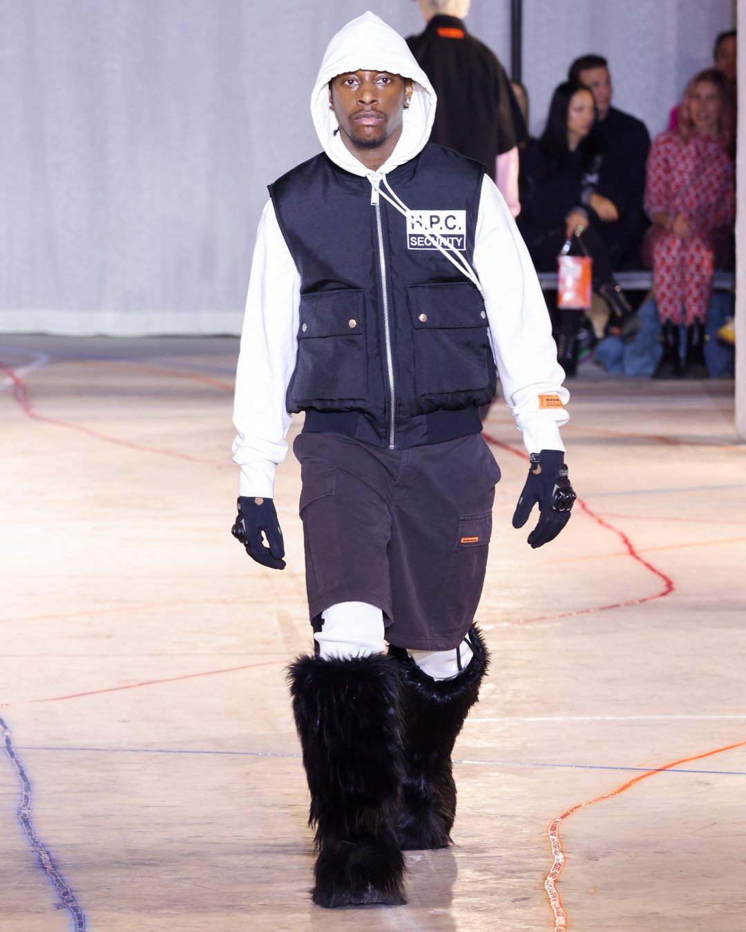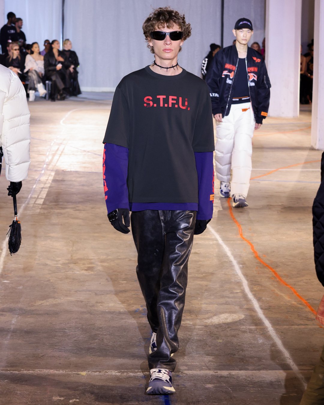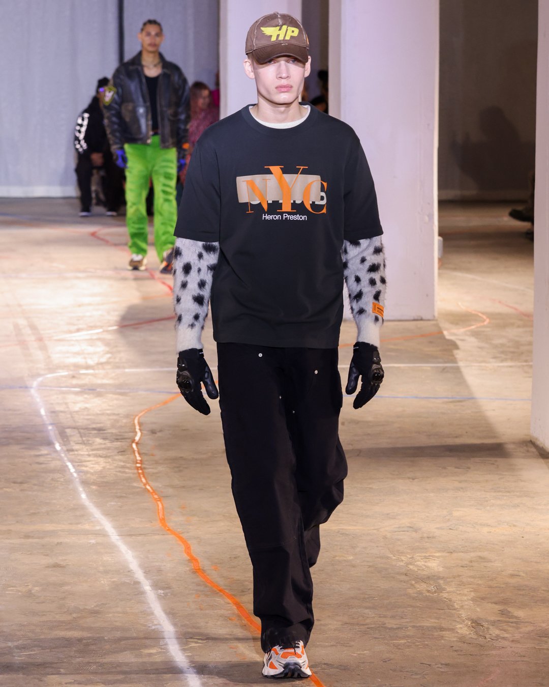 “What is this?”, “Do I keep it?”, “Low-key I think there’s dog pee on this one,” says Heron Preston as he collects trash from downtown New York streets and loads it into his Mercedes G-Wagon in a video posted on his Instagram the week of his FW23 show. The items from the street were brought back to the designer's studio to be repurposed for show invites as part of his L.E.D. practice (Less Environmentally Destructive). This was the prelude to Preston’s debut at New York Fashion Week, titled “Anything Goes”, where he had the prime time slot of the week. February 11th, Saturday at 6 pm, in an empty industrial space in Soho emerging from darkness were four hi-vis clad workers wheeling spray paint line marking applicators. As they walked around the space marking the exposed concrete floors, it becomes apparent Preston is the fourth line marker - welcome to Preston’s industrial New York streets.