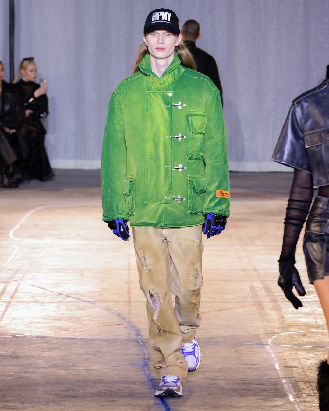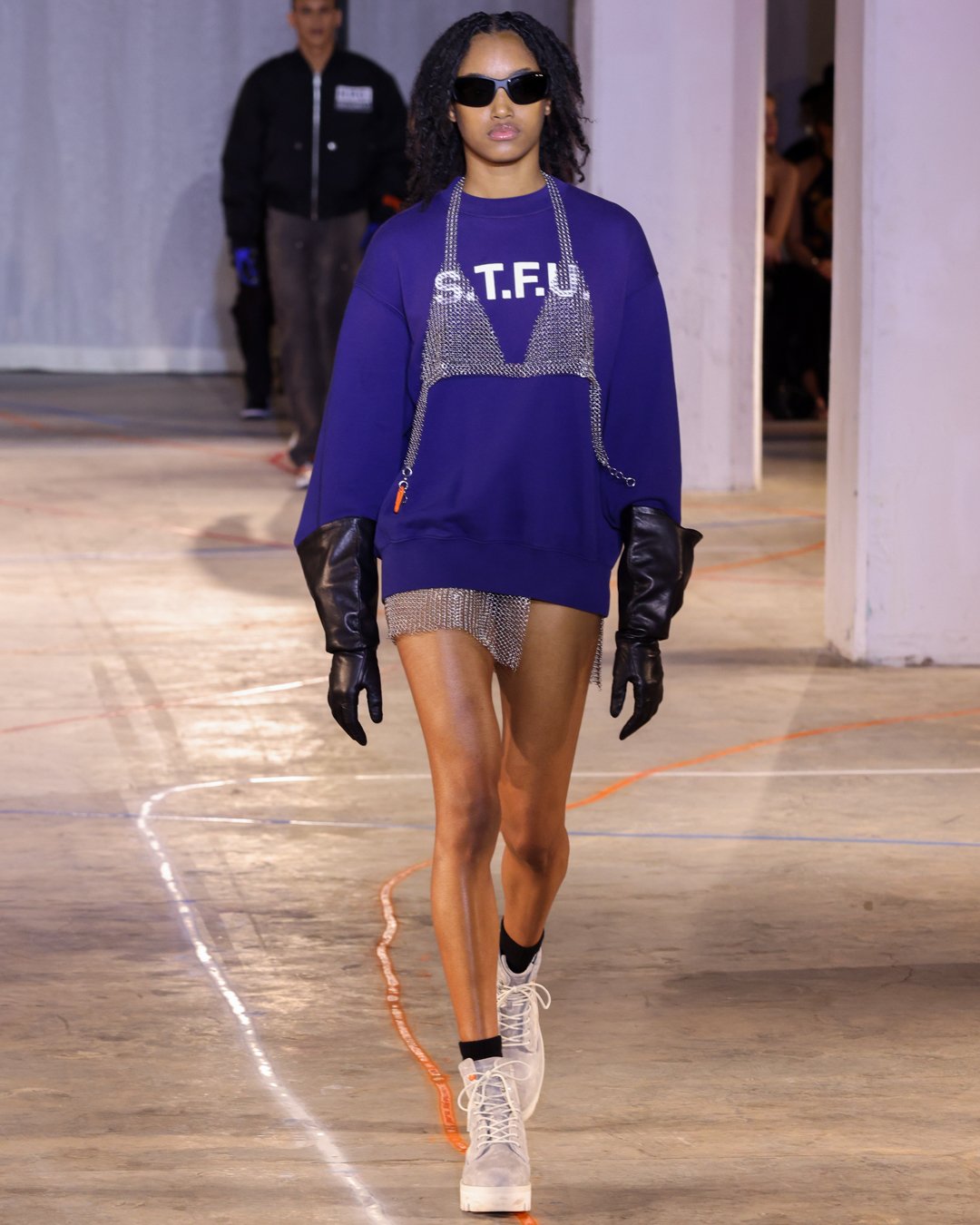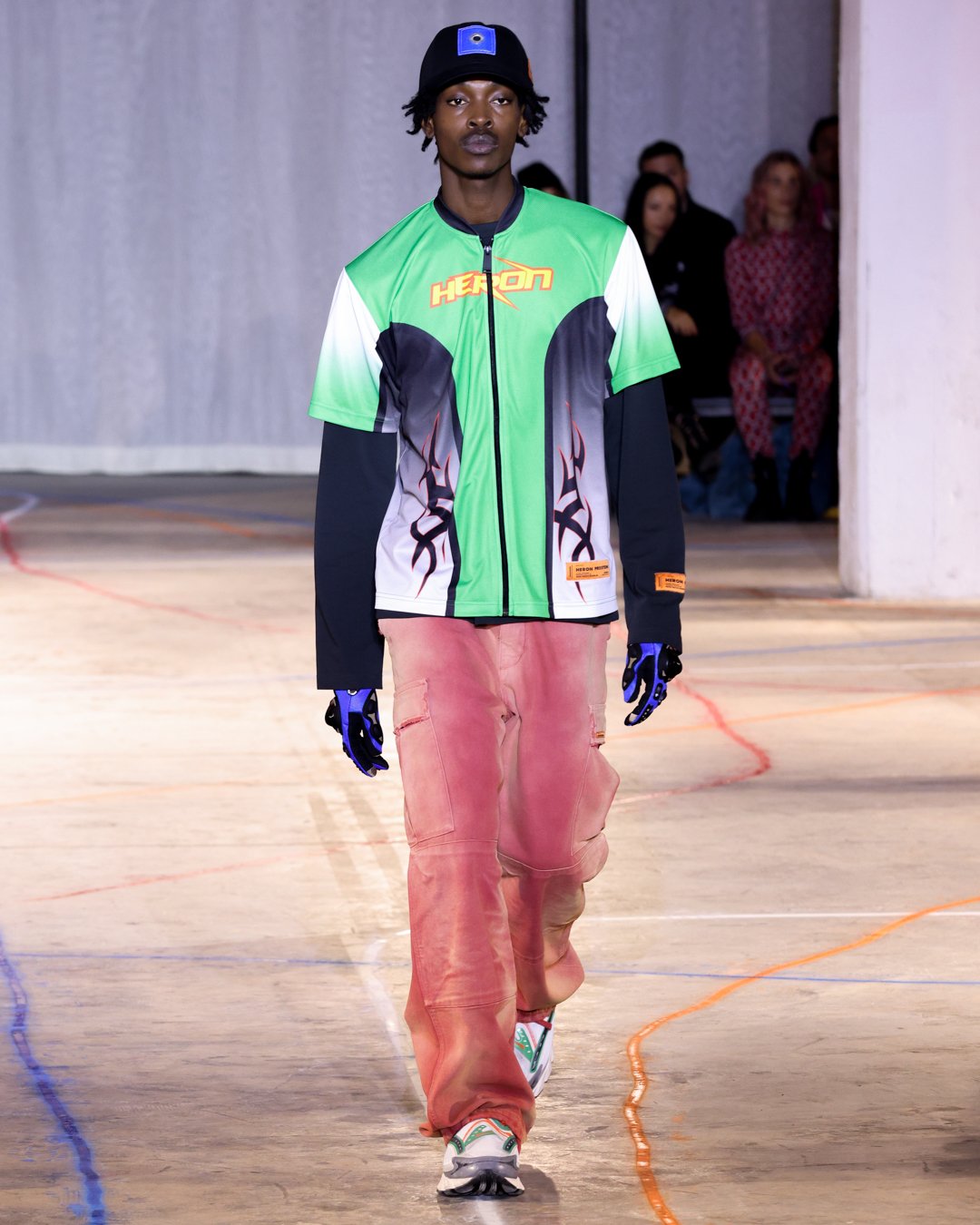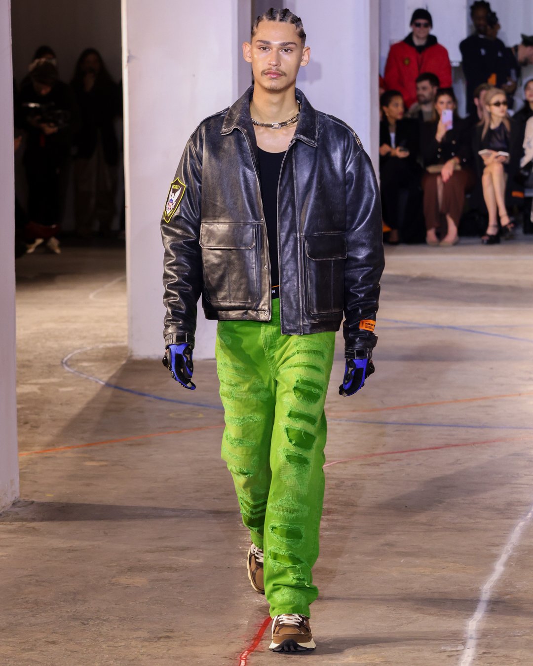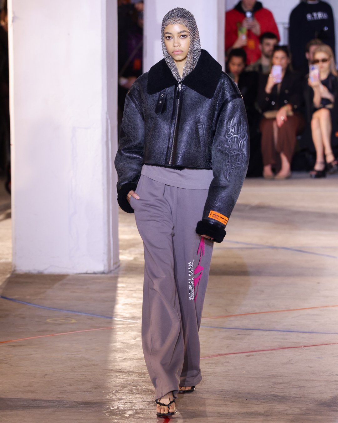 “What is this?”, “Do I keep it?”, “Low-key I think there’s dog pee on this one,” says Heron Preston as he collects trash from downtown New York streets and loads it into his Mercedes G-Wagon in a video posted on his Instagram the week of his FW23 show. The items from the street were brought back to the designer's studio to be repurposed for show invites as part of his L.E.D. practice (Less Environmentally Destructive). This was the prelude to Preston’s debut at New York Fashion Week, titled “Anything Goes”, where he had the prime time slot of the week. February 11th, Saturday at 6 pm, in an empty industrial space in Soho emerging from darkness were four hi-vis clad workers wheeling spray paint line marking applicators. As they walked around the space marking the exposed concrete floors, it becomes apparent Preston is the fourth line marker - welcome to Preston’s industrial New York streets.