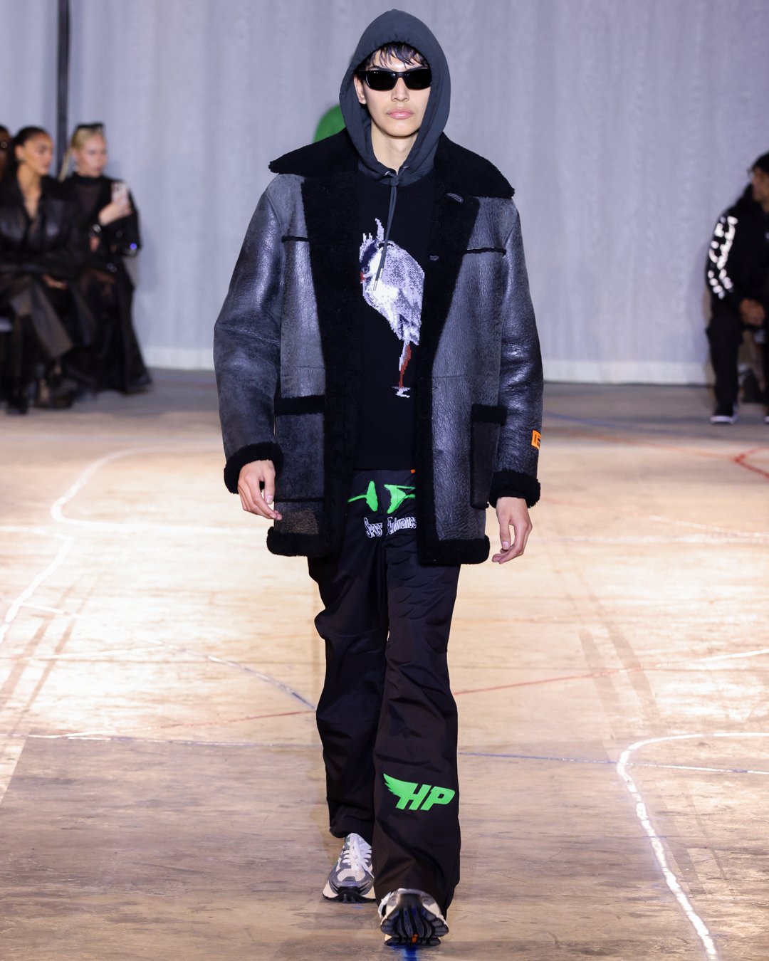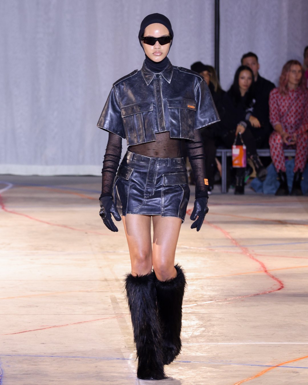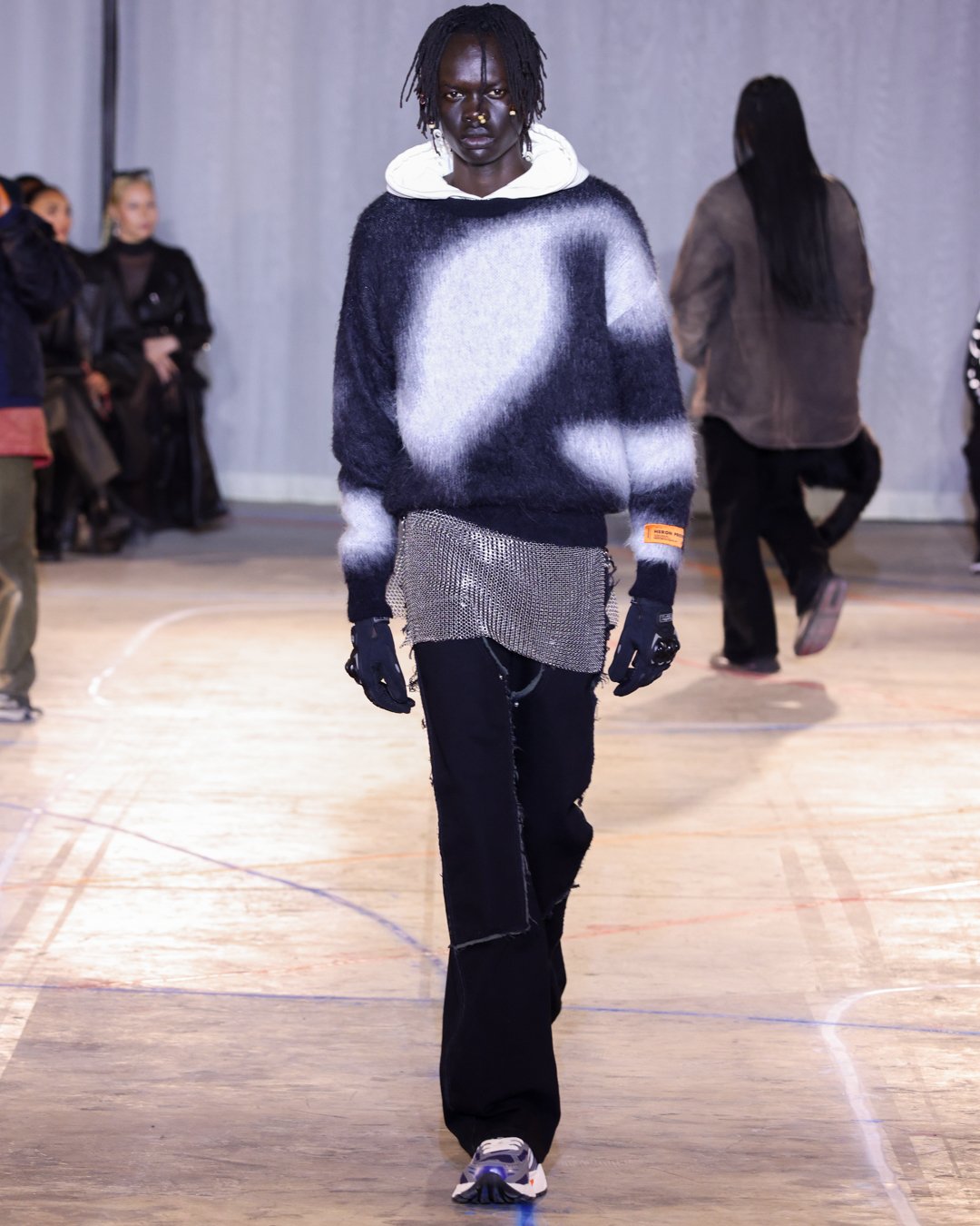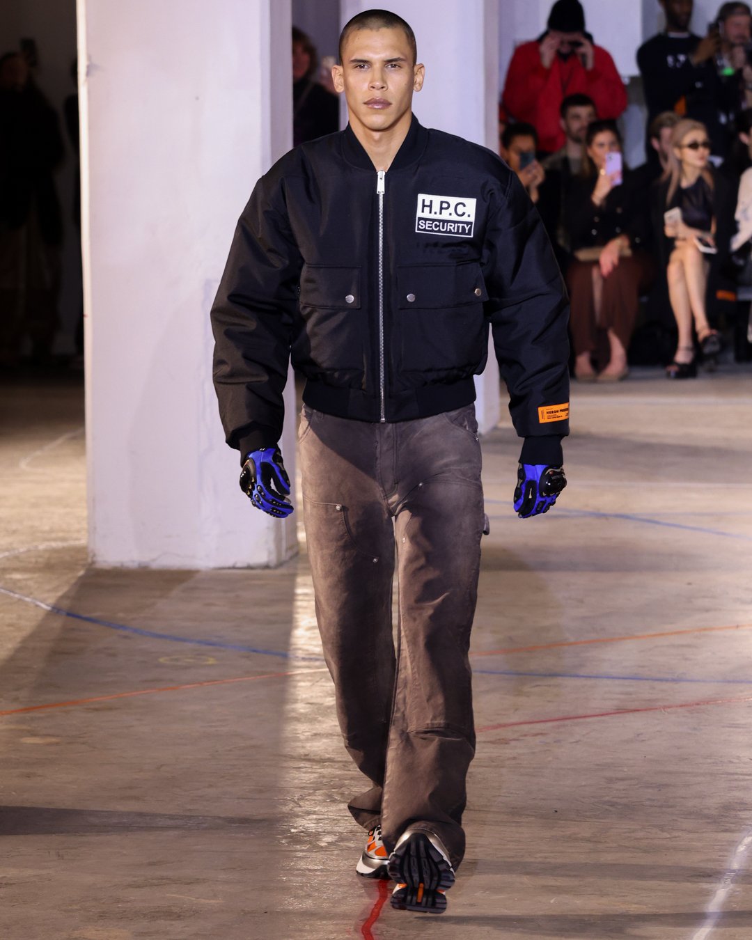“What is this?”, “Do I keep it?”, “Low-key I think there’s dog pee on this one,” says Heron Preston as he collects trash from downtown New York streets and loads it into his Mercedes G-Wagon in a video posted on his Instagram the week of his FW23 show. The items from the street were brought back to the designer's studio to be repurposed for show invites as part of his L.E.D. practice (Less Environmentally Destructive). This was the prelude to Preston’s debut at New York Fashion Week, titled “Anything Goes”, where he had the prime time slot of the week. February 11th, Saturday at 6 pm, in an empty industrial space in Soho emerging from darkness were four hi-vis clad workers wheeling spray paint line marking applicators. As they walked around the space marking the exposed concrete floors, it becomes apparent Preston is the fourth line marker - welcome to Preston’s industrial New York streets.