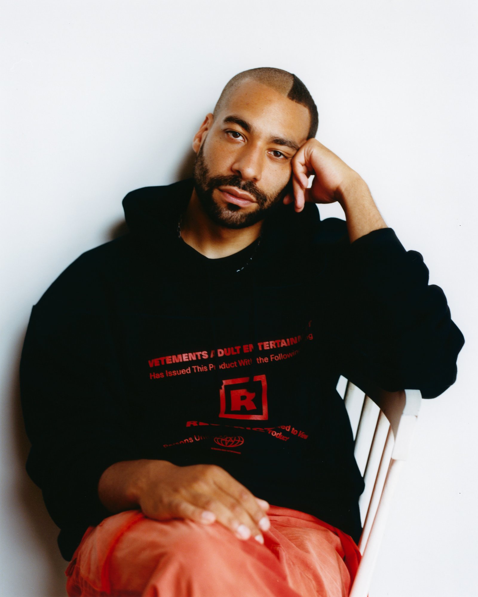 Guarionex wears hoodie VETEMENTS courtesy of stylist’s studio. Jumpsuit LOEWE.
