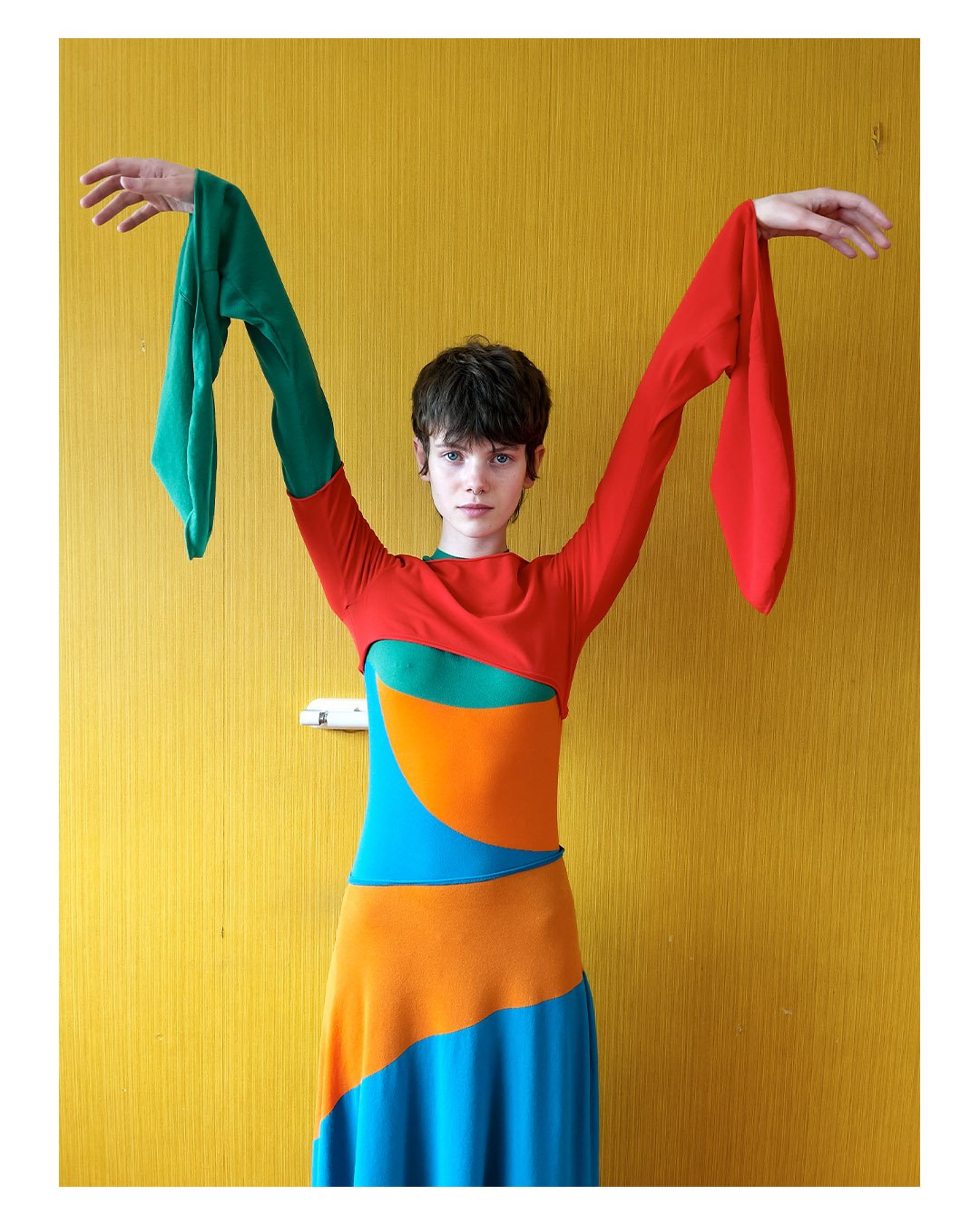 A raspberry pink fisherman’s vest with two blue strawberries printed on its oversized pouches, a tromp d’oeil vest printed onto a shag sweater, carnival-striped dresses and gumball-bead dresses are just the beginning of Anderson’s playground. His primary-school palette of candy apple red, lemon yellow, bright blue and shamrock green is both lighthearted and bold. The urgency of the vibrant colours speak to the private fantasies of our idealized selves conjured in our childhood dreams that only reach maturity should we be so brave. While today’s youth may have missed out on a year of romping through streets, arm-in-arm with friends as a way of learning who they are in the mirror of their peers, the kind of introspective daydreams that happen at home are just as essential to envisioning who we want to become.