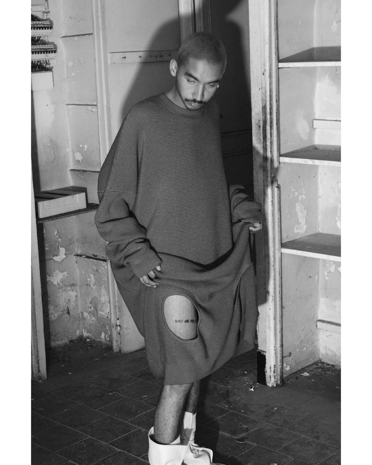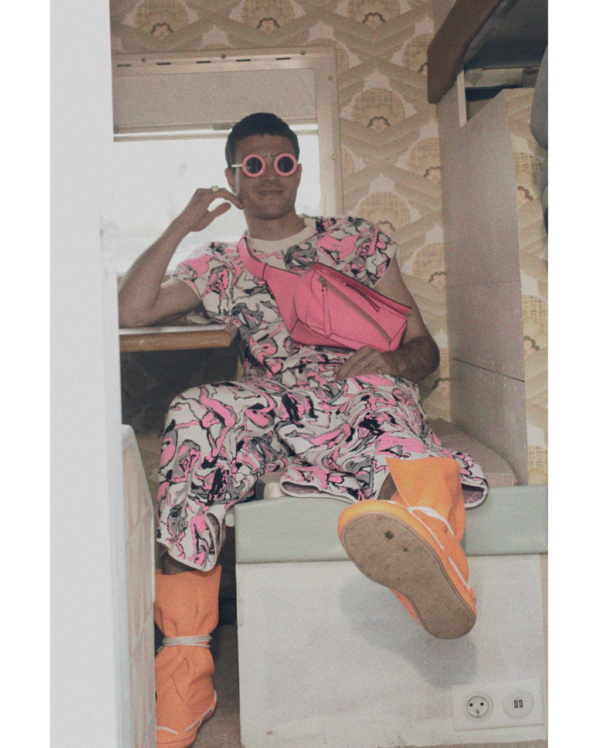This season, Anderson takes an interest in a playful vulnerability, like a laugh coughed out just a little too loud. Cotton rib is commonly used throughout the collection, adding Loewe’s spin on the subversive basics trend taking residence across trendy torsos this summer. Simple, breathable, nostalgic, and slinky, the cotton rib tank is splattered with solar print silhouettes of couples in a hot pink pattern. A Sherpa bum bag in the same rousing pink is the perfect storage for water bottles, your dead cell phone, keys, cash, and perhaps a cigarette unraveling from its filter as you dance to the beat.