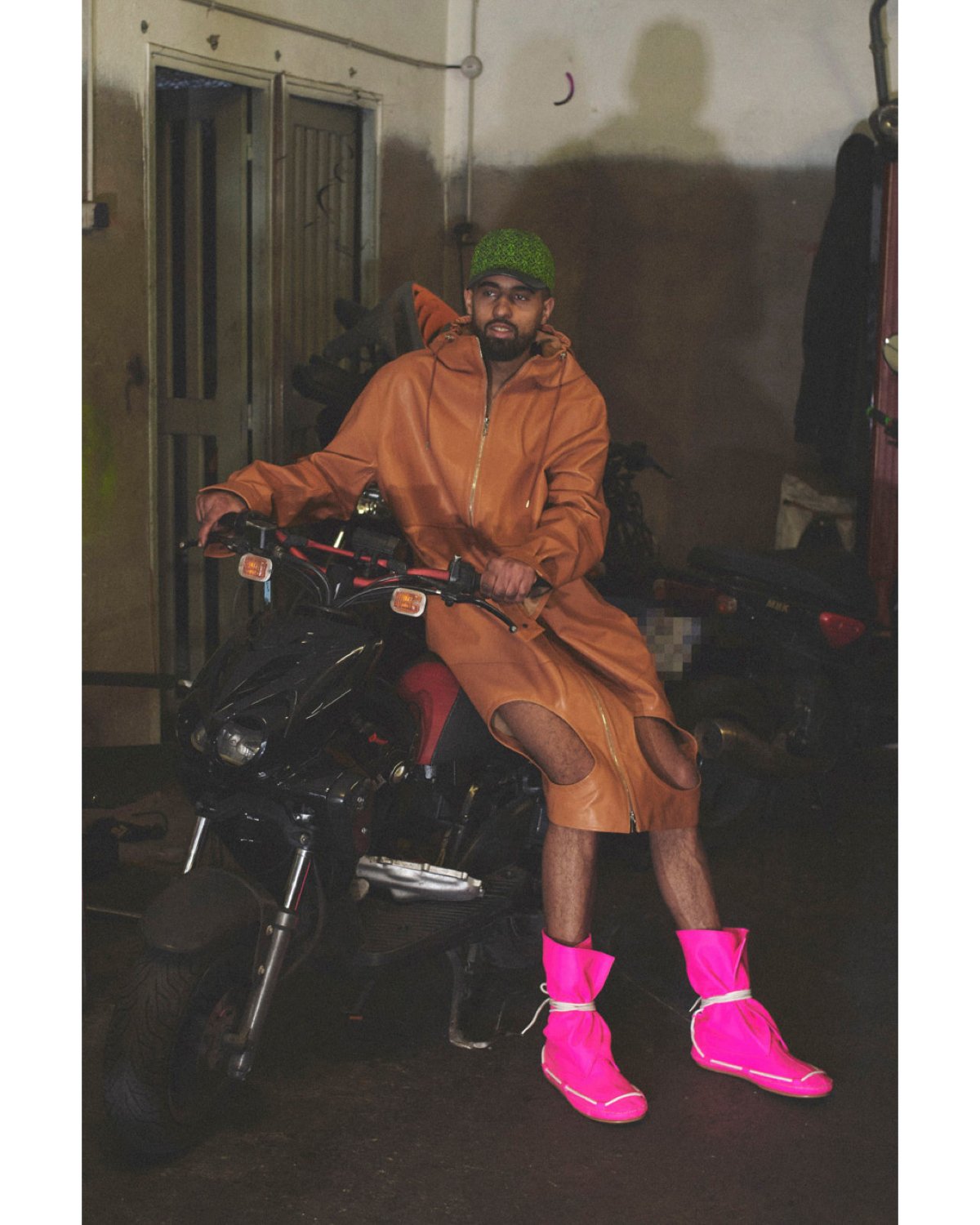 An intricately printed trench in green and black makes a return to Loewe with matching cinched moon boots. The scooped backplate of a glistening black jacket refracts prismatic beams from club lights. Layered, microscopically knit mesh sets in classic rave colors swaddle the silhouette in a gauzy glow. Anderson experiments with cactus leather, a glossy, eco-friendly alternative for the traditional textile, asserting that his progressive vision doesn’t stop short at climate concern. Cable knit cut-out sweaters and dresses flirtatiously reveal breasts, thighs, and layers—a zebra-print glitter tunic and shorts sparkle in orange hues and classic monochrome—a russet playsuit pools around the body, fastened by horn buttons in a rib-knit. A heatmap mohair sweater in bubblegum pink and turquoise steals the show with orange leather pants, sure to keep you warm on your morning walk home from the rave, birds happily chirping above.