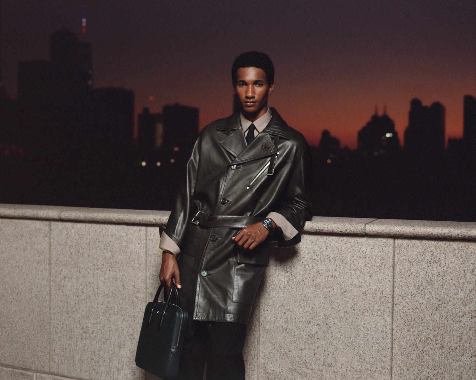Coat, shirt, pants, tie and watch HERMÈS. Bag MONTBLANC.