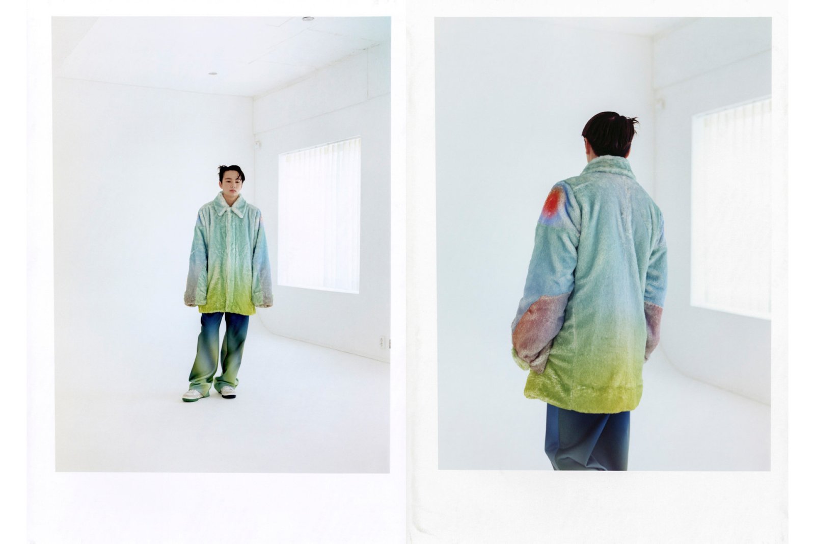 Co-founders Hansol Kim and Taehan Roh started conceptualizing Lynder as students at Oxford and CalArts, out of the desire to create their own world based on common interests. Lynder, established in 2019, is their fictional universe where clothing is merely a means to externalize their animated protagonists. They appear episodically rather than seasonally, going against the traditional fashion calendar. Lynder manifests the founders’ ideal definition of masculinity through experimentation in tailoring and layering. Their most recent and fourth collection, “SUNSET WAVES,” was particularly inspired by the vast sea of the Icelandic coast of Reynisdrangar, and Japanese Sci-Fi horror writer Hideyuki Kikuchi.