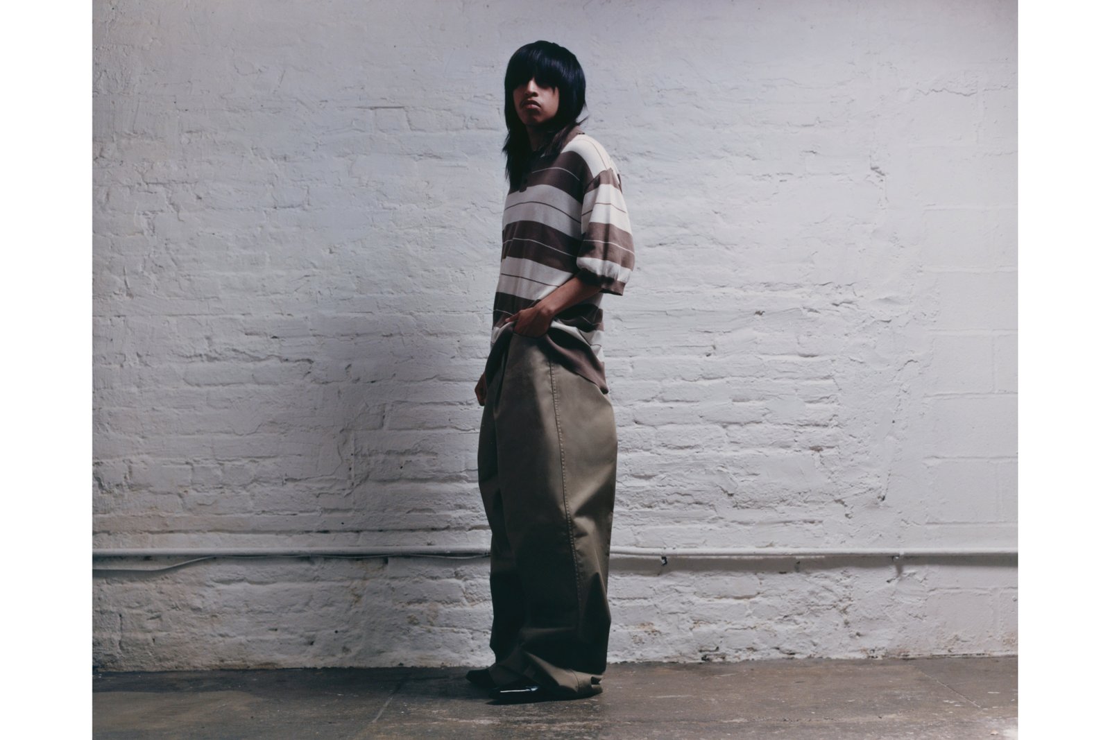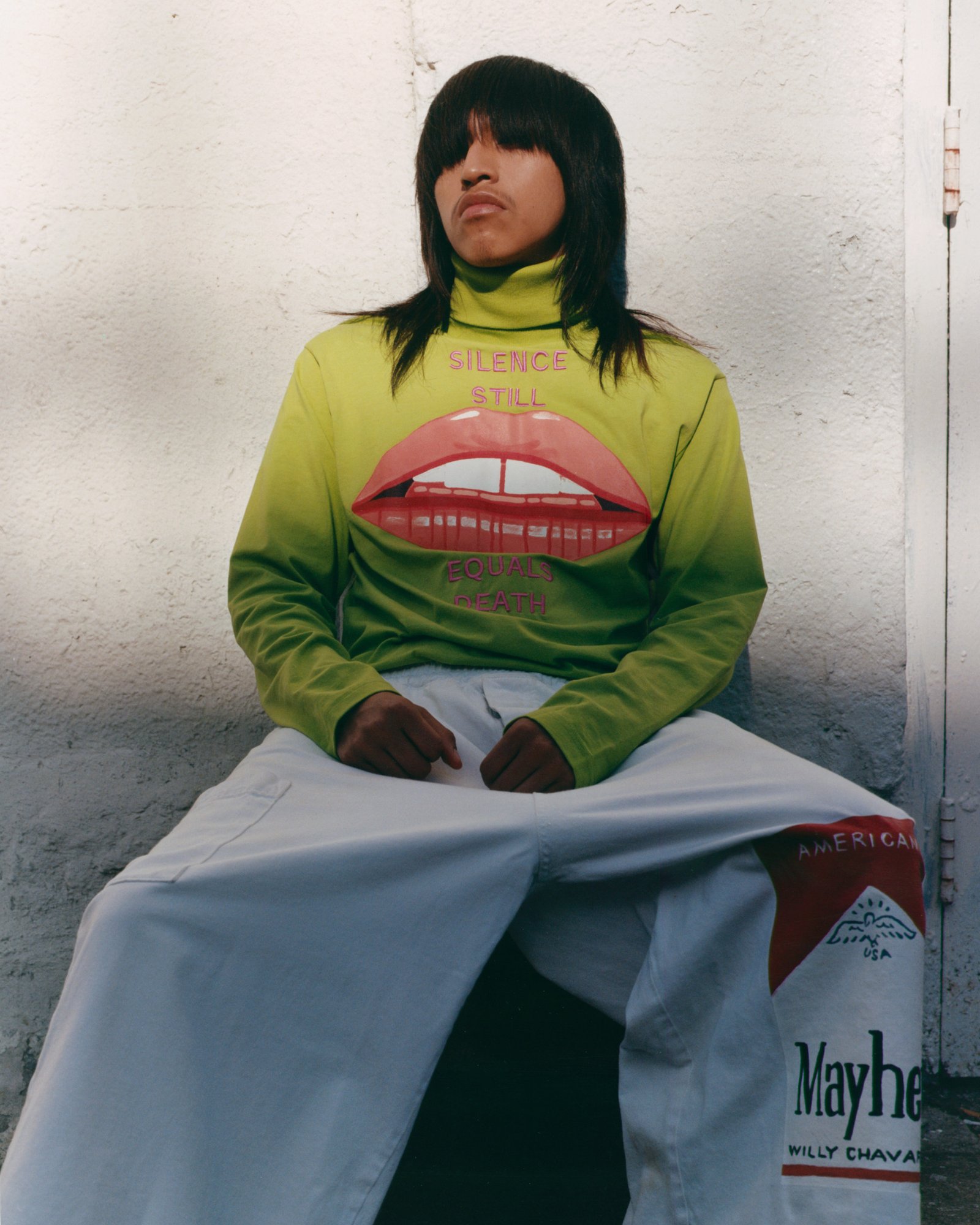 Thursday wears shirt WILLY CHAVARRIA Spring/Summer 2022. Trousers WILLY CHAVARRIA Fall/Winter 2022. Shoes archive HELMUT LANG courtesy of Dominik Halás.