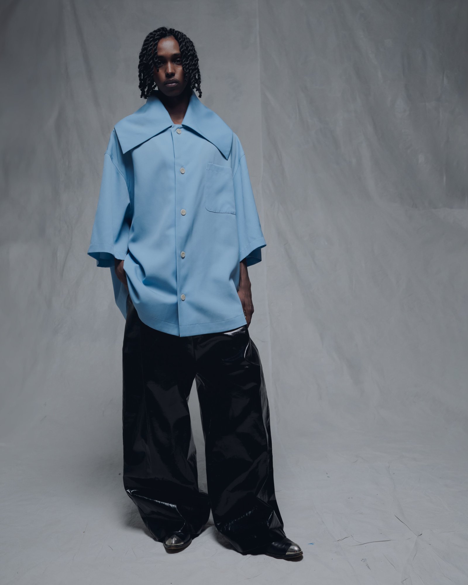 Yuji wears shirt and trousers WILLY CHAVARRIA Fall/Winter 2022.