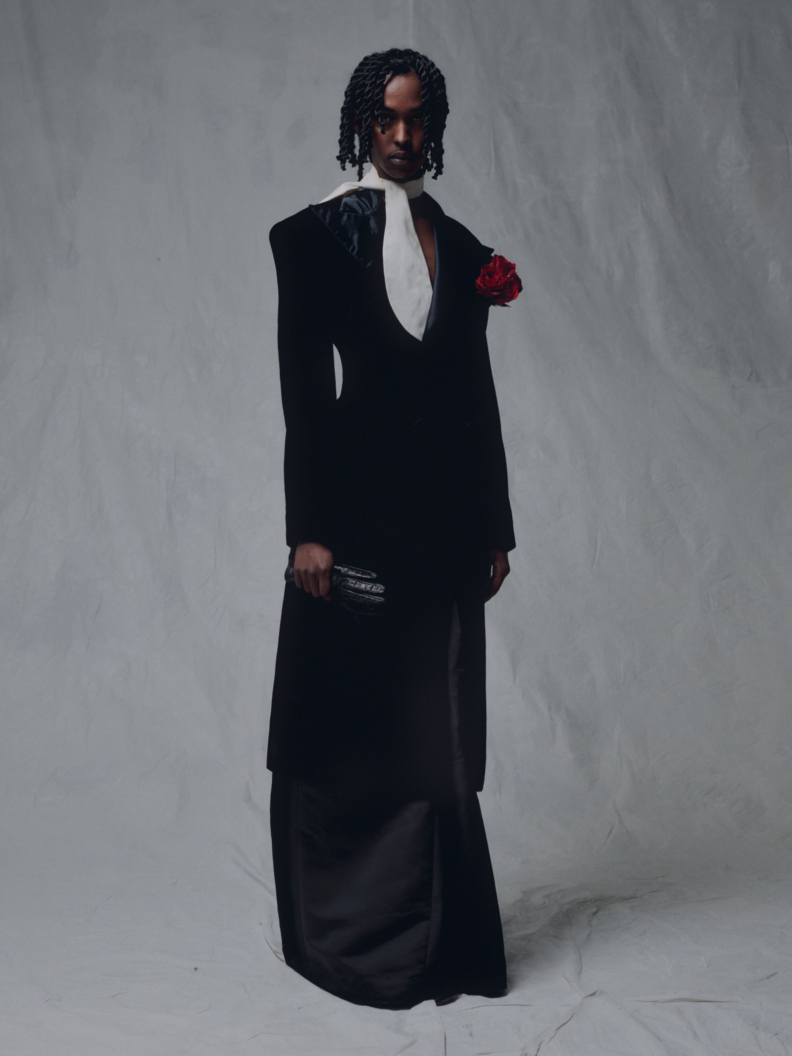 Thursday wears blazer, pants, scarf and gloves WILLY CHAVARRIA Fall/Winter 2023.