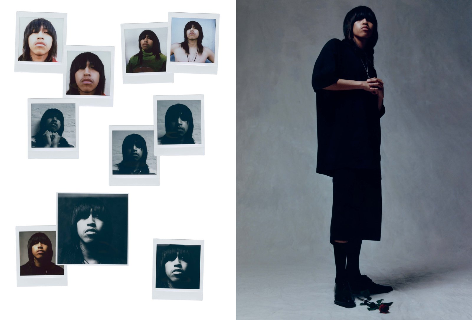 Yuji wears t-shirt and shorts WILLY CHAVARRIA Spring/Summer 2023. Socks FALKE. Shoes stylist’s own. Necklace model’s own.